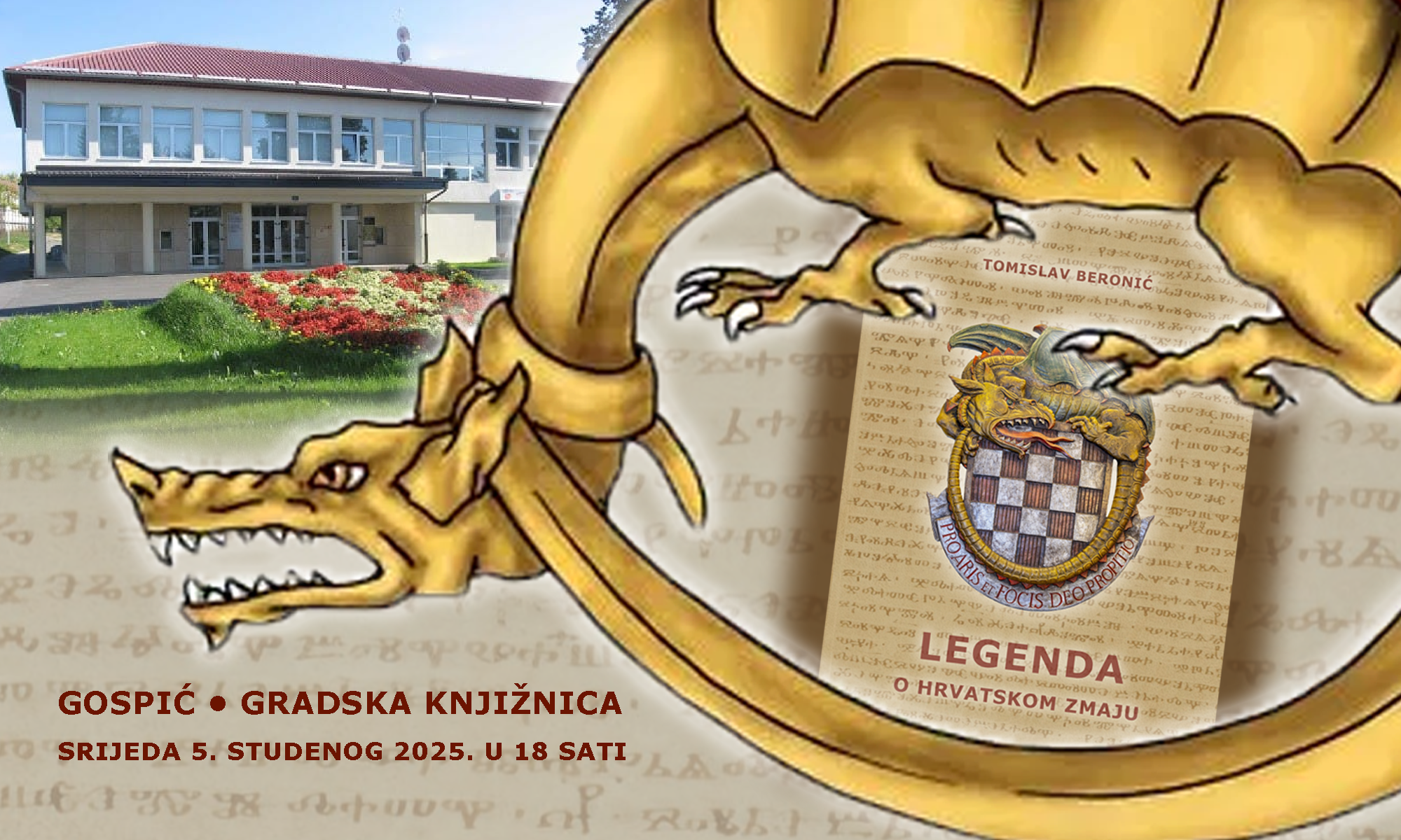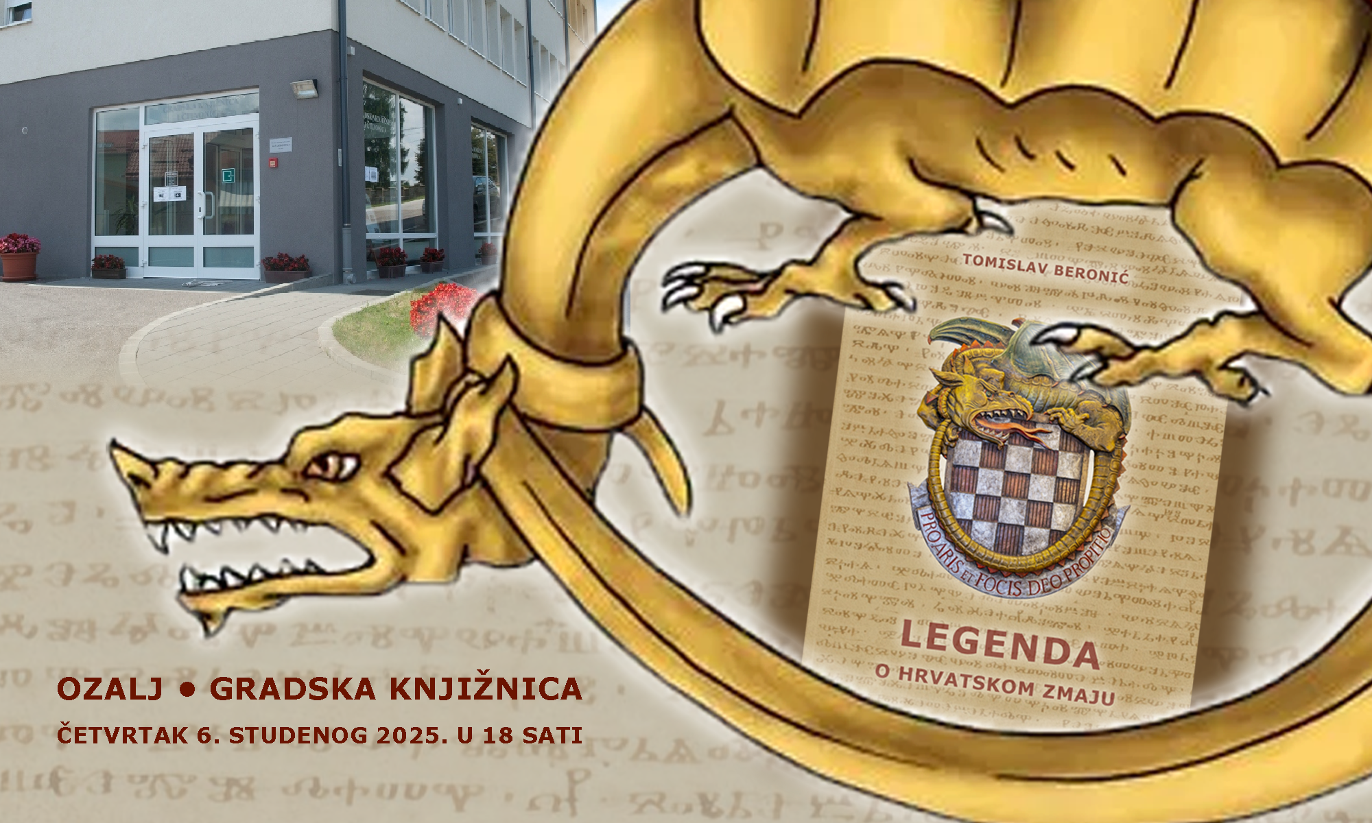 Pozivamo vas na posebno predstavljanje povijesnog romana "Legenda o hrvatskom zmaju", napisanog u čast 120. obljetnice osnutka Družbe "Braća Hrvatskoga Zmaja" i 1100 godina Hrvatskoga Kraljevstva.U romanu glavni lik nije čovjek, već zmaj – personifikacija hrvatske zemlje i naroda, kojega sv. Juraj ostavlja u domovini kojom vladaju petorica braće i dvije sestre. Hrvati su više od tisuću i pol godina čuvali tajnu zmaja, a on im je uzvraćao snagom zemlje. Osnivanjem Družbe "Braća Hrvatskoga Zmaja" započelo je ispunjavanje davnog proročanstva i približio se trenutak kada će se hrvatski zmaj otkriti cijelom svijetu.- Roman je objavljen u dva izdanja – latinicom i glagoljicom, a na predstavljanju ćete ga moći kupiti po promotivnim cijenama.- U sklopu događaja bit će postavljena i prodajna izložba originalnih slika inicijalnih slova glagoljskog izdanja, autora Emila Faldića.- Dođite, otkrijte priču o hrvatskom zmaju i budite dio posebne književne večeri!