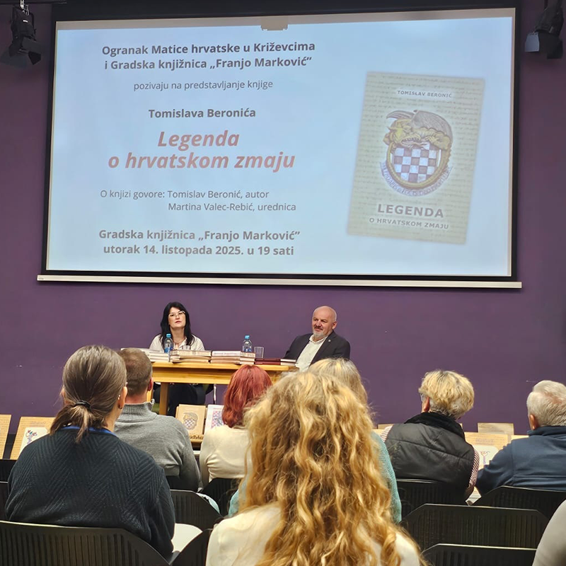 Po drugi put ove godine Ogranak Matice hrvatske u Križevcima bio je Bibi i meni domaćinom predstavljanja knjige u Gradskoj knjižnici „Franjo Marković“. Ovog puta tema je bila roman „Legenda o hrvatskom zmaju“ napisana u čast 120 obljetnice osnutka Družbe „Braća Hrvatskoga Zmaja“ i 1100 godina Hrvatskoga Kraljevstva. Dobrodošlicu u knjižnicu i nama „izvođačima programa“ i svim gostima poželjela je knjižničarka Martina Majdak, a u ime organizatora predsjednica OMH Križevci srdačna i otvorena Renata Husinec istaknuvši važnost čuvanja povijesne baštine i prenošenja tog osjećaja mladima koji su na ovo predstavljanje došli u povelikom broju. Da je roman zanimljiv, pa čak i pomalo provokativan, i to već po svom naslovu u svom je osvrtu istaknula urednica knjige Martina Valec Rebić, s kojom već godinama surađujem na jednom drugom projektu – igri i natjecanju GlagoMatika. (...više)